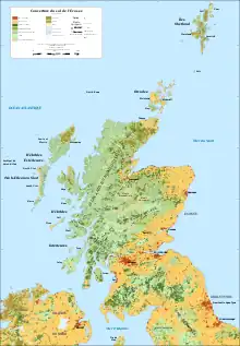 L'Écosse compte de nombreux archipels, regroupant près de 790 îles[24]. Les trois principales sont les Shetland, au nord, les Orcades, au large de Thurso, et les Hébrides, au nord-ouest. L'île de Skye fait partie des Hébrides Intérieures, au même titre que l'île de Mull. Les côtes, à la manière des fjords, sont très découpées et constituées de falaises ou de rochers, mais on rencontre également des plages de sable.