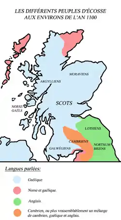 Sur le plan linguistique, la majorité des personnes vivant alors en Écosse parle le gaélique, appelé ensuite simplement « Écossais », ou en latin, lingua Scotica[46]. Les autres langues parlées à cette époques sont le norrois et l’anglais, ainsi que le cambrien, qui disparait au Xe siècle. Le picte a pu survivre lors de cette période, mais il n’est pas certain. À partir de l’accession au trône de David Ier, et peut-être même avant, le gaélique cesse d’être la langue utilisée à la cour royale.