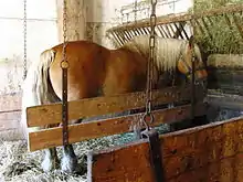 Dans une stalle, le cheval est attaché tête au mur et est séparé des autres par une cloison latérale[2],[6]. Sa liberté de mouvement est limitée. Devant chaque cheval sont placés un râtelier à foin et une mangeoire[2]. Un système coulissant attaché à son licol dit « à billot » lui permet de se coucher[2],[6]. La stalle a l'avantage d'être facile d'entretien puisque la zone de dépose du crottin est toujours accessible[2]. De plus, le cheval ne pouvant se retourner, il ne peut consommer de la paille souillée et risquer d'être réinfecté par ses parasites intestinaux[6].