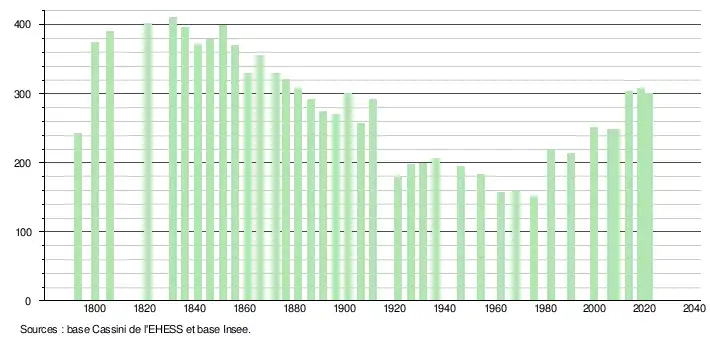 L'évolution du nombre d'habitants est connue à travers les recensements de la population effectués dans la commune depuis 1793. Pour les communes de moins de 10 000 habitants, une enquête de recensement portant sur toute la population est réalisée tous les cinq ans, les populations légales des années intermédiaires étant quant à elles estimées par interpolation ou extrapolation[24]. Pour la commune, le premier recensement exhaustif entrant dans le cadre du nouveau dispositif a été réalisé en 2008[25].