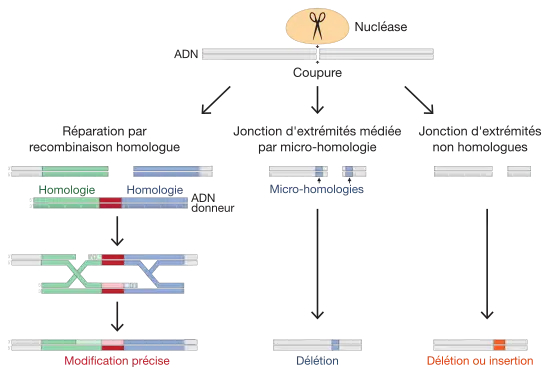 - la recombinaison homologue (RH) : c’est un type de réparation par recombinaison génétique où, à la suite d'une coupure de l'ADN, les séquences de nucléotides sont échangées entre des molécules d'ADN identiques ou similaires. Ce mécanisme est aussi à l’œuvre lors du processus de méiose, par lequel les eucaryotes créent des gamètes et de nouvelles combinaisons génétiques. La réparation par recombinaison homologue est extrêmement précise et permet d'effectuer divers types de modifications de l'ADN : mutations ponctuelles (par exemple la mutation d'un nucléotide), insertion d'étiquettes moléculaires (par exemple l'insertion de tags pour la purification biochimique pour le suivi de la localisation cellulaire en imagerie), délétions, etc. En pratique, afin de modifier un gène par recombinaison homologue, il est nécessaire d'introduire dans les cellules : 1) la nucléase dirigée contre le gène à modifier et 2) un ADN donneur qui contient la modification d'intérêt (par exemple un tag) flanqué par des séquences d'ADN dites d'homologie (identiques aux séquences situées de part et d'autre du site de coupure par la nucléase) ;