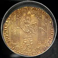 Cependant, les Français invoquent la loi salique et dénigrent ses revendications en reconnaissant le neveu de Philippe IV, Philippe VI, de la maison des Valois, comme véritable héritier. En réponse, Édouard se déclare, en à Gand, lui-même roi d'Angleterre et de France. En incorporant ses propres armoiries anglaises, les trois léopard d'or sur champ de gueules, aux armoiries de la France, les trois lys, d'or sur champ d'azur, il présente un nouveau blason personnel, marquant sa revendication des deux royaumes[21], et date alors ses actes « de la quatorzième année de (son) règne en Angleterre et de la première en France »[22]. Pour faire valoir ses droits, il entre en conflit armé avec la France, marquant ainsi le début de la guerre de Cent Ans.