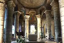 Des fresques romanes ne subsistent que celles du cul-de-four au-dessus du chœur et de la crypte. Au-dessus du chœur, on distingue encore une représentation peu fréquente de l'apocalypse : la Vierge à l'Enfant est représentée dans une mandorle, le Christ est en majesté sur la voûte, entre un cercle et un carré, puis l'Agneau Mystique est représenté dans un cercle. Tout autour, sous des arcatures, les 12 apôtres sont représentés assis, comme sur la façade. Les historiens de l'art pensent aujourd'hui que cette peinture a servi de modèle pour les sculptures de la façade, les attitudes et la composition étant identiques. Dans les angles, des anges accompagnent les âmes au paradis. Dans la crypte, les fresques représentent des saints anonymes. Quelques traces de représentations d'animaux apparaissent sous les enduits dans le collatéral nord.