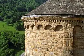Ses arcatures lombardes sont surmontées d'une frise de blocs et d'une corniche biseautée.