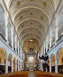 • La nef est ample et donne une impression de calme et prospérité. Elle est bordée de bas-côtés (de style basilical) dont les galeries supérieures sont soutenues par d’élégantes colonnes (qui avant l’incendie de 1718 étaient de marbre). De larges fenêtres donnant dans ces galeries supérieures permettent à la lumière d’entrer en abondance dans l’église.