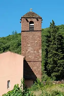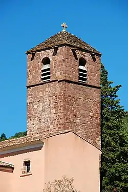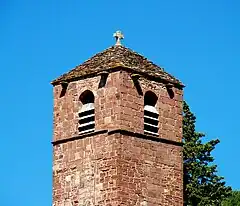 Le dernier niveau, enfin, est percé sur chaque face d'une baie campanaire à abat-son et surmonté d'une courte toiture en pyramide couverte de lauzes et sommée d'une croix en pierre.