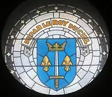 Un vitrail en rosace avec deux fleurs de lys de part et d'autre d'une épée surmontée de la couronne royale rappelle ce passage.