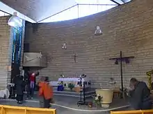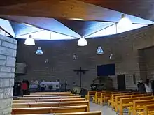 L'église a été construite avec les mêmes matériaux que ces des immeubles qui l'entourent : béton et pierres de parement mais aussi bois, verre et métal[1].