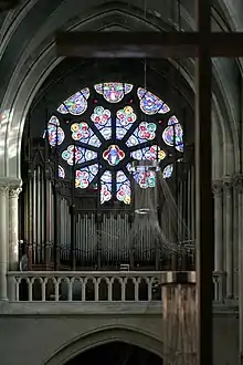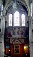 Au-dessus des portes, deux vitraux : le roi David et sainte Cécile, et une rosace : la Vierge Marie au ciel.