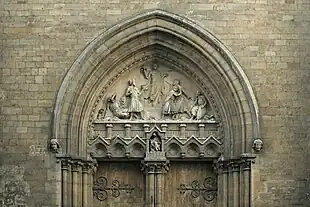 Portail central (œuvre d'Aimé-Napoléon Perrey) : l’ange Gabriel annonce à Zacharie la naissance d'un fils, Jean. Marie visite sa cousine Élisabeth. La naissance de Jean. La prédication de Jean. Jean baptise Jésus. Jean critique Hérode. Jean est décapité, sa tête est apportée à la fille d'Hérodiade (Luc 1-3 ; Marc 6,17-29). Le Christ en gloire.