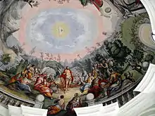 Les fresques de la nef représentent la vie de saint Jean-Baptiste, avec sa prédication et sa décollation, et les scènes sont peintes derrière des balustrades qui accentuent l'aspect théâtral des œuvres. On découvre la signature Carl Thalhaimer pinxit 1752 sur la balustrade nord-est. La fresque de Thalhaimer de la coupole du chœur représente Dieu le Père trônant dans les nuages entouré d'anges. Elle est plus pâle et légère que le décor exotique du Jourdain sur les murs derrière l'autel, peint par un autre maître.