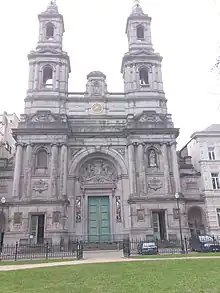 Dotée d'une façade en pierre bleue, l'église comporte trois nefs de hauteur égale et fait un total de 66 mètres de longueur et de 26 mètres de largeur. Sa voûte, de 18 mètres de haut, est en outre supportée par deux rangées de colonnes de style corinthien qui séparent les deux nefs latérales de la principale. Le Triomphe de la Foi est le relief sculpté au-dessus du portail central.
