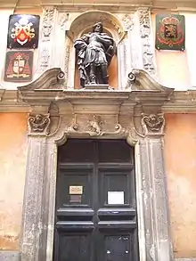 La façade baroque est ornée d'une statue de Saint-Julien l'hospitalier surmontant l'entrée principale et d'une inscription latine résumant l'histoire du bâtiment jusqu'en 1785 :