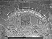 On peut y apercevoir une croix pattée centrale, une chèvre, un chien, un animal fantastique avec deux gros yeux ronds, un poisson, un damier, une chaîne et des guirlandes. Seuls les chapiteaux des piliers latéraux sont décorés.