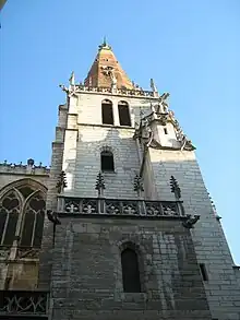 L'édifice est classiquement entamé par le chœur, le transept puis les travées de la nef. Le clocher nord est posé en 1481[30], en même temps qu'une première horloge construite et entretenue par des artisans lyonnais[31].