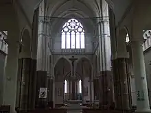 L'église avait un plan en forme de croix latine et se caractérisait par un impressionnant volume intérieur, notamment dans sa partie néo-gothique, où les voûtes étaient plus élevées que celles de la nef.