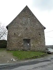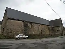La grande porte ouest en plein cintre était jusque dans les années 1920 protégée par un porche d'ardoises reposant sur deux piliers de bois, comme le prouve un plan de 1830. On en remarque encore des traces de solin au-dessus de la porte. Sous ce chapiteau se trouvait fixé le crucifix.