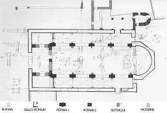 À l’époque romaine, le bâtiment est utilisé comme une basilique civile[4] ou comme un palestre dans un ensemble thermal[5]. Au VIIe siècle, il devient l'église d’une abbaye bénédictine[5].