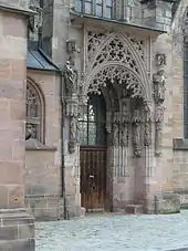 Le Brautpforte, le portail des fiancés, avec deux fois cinq statues des Vierges sages et Vierges folles, réalisé en 1320-1330. La dentelle de pierre devant le portail a été ajoutée vers 1360 lors de la construction du chœur Est, et elle masque le Christ bénissant au-dessus de la porte d'entrée. Deux autres statues encadrent le portail : un Vierge à l'Enfant à gauche, et un saint Sébald en pèlerin portant son église à droite, plus tardives. Le portail des fiancés est le nom d'un portail, généralement couvert, sur le côté Nord d'une église où avait lieu, avant l'introduction du rituel actuel du mariage dans l’église même par le concile de Trente, la cérémonie du mariage. Les fiancés, mariés devant cette porte, entrent ensuite ensemble dans l'église pour assister à un service religieux. Le portail de Saint-Sébald, richement décoré, et situé sur la façade Nord, date du XIVe siècle.