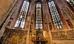 Dans le chœur-halle, un ensemble de vitraux, dons des membres du conseil municipal, sont conservés. Les vitraux centraux datent du XVIe siècle ont été réalisés par le peintre vitrier Veit Hirschvogel d'après des cartons d'Albrecht Dürer et Hans von Kulmbach. Les autres remontent à 1379.