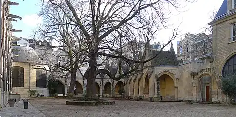 L'intérêt architectural de l'église réside également dans son charnier, ancien cimetière paroissial. L'église Saint-Séverin présente en effet la particularité, exceptionnelle à Paris, d'avoir conservé quasiment intact l'emplacement de son cimetière et de son charnier. Ce cimetière, ouvert vers 1250, fut entouré sur trois côtés d'une galerie, analogue à celle d'un cloître, construite vers 1430, galerie qui fut utilisée à la fois comme charnier et résidence pour les prêtres de la paroisse, avec des étages dédiés. Mais dès 1674, les marguilliers décidèrent d'interdire les inhumations et de fermer les charniers, l'ensemble devenant alors un simple cloître. Les baies de la galerie furent ornées de vitraux quelques années plus tard, en 1699. Au début du XIXe siècle, des travaux d'alignement firent disparaître les deux galeries sises à l'ouest. Avec la petite porte qui donnait de ces galeries vers la rue de la Parcheminerie, disparut une inscription mémorable : Passant, penses-tu passer par ce passage où, pensant, j'ai passé ? Si tu n'y penses pas, passant, tu n'es pas sage, car en n'y pensant pas, tu te verras passé[9]. En 1926, on a construit à leur place un bâtiment aux fenêtres ogivales pour servir de presbytère, ce qui a permis de faire disparaître les deux étages supérieurs réservés au logement des prêtres. Aujourd'hui cet ensemble, désormais transformé en jardin, est classé.