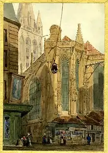 À l'extérieur, du côté de la rue Froide, un escalier intrigue les archéologues. Sa destination reste encore un mystère. Selon Henri Prentout, il ne donne accès ni à une tribune dédiée à de riches paroissiaux, ni à un oratoire privé pour les prêtres, ni à une chaire extérieure. Selon lui, il s'agit d'une monstrance qui servait à montrer des reliques surnommées « le Verdun », du nom de leur donateur[11]. Mais cet usage n'a jamais été véritablement prouvé. Le porche d’entrée avec son portail date du XVe siècle. La tour du 1XIVe siècle est terminée par une pyramide percée de trèfles et de rosaces.