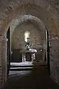 Elle comprend une nef unique et un chœur quadrangulaire de forme légèrement trapézoïdale La voûte et son arc central sont en berceau légèrement brisé de même que l’arc triomphal qui sépare la nef du chœur.