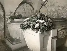 Les restes de Jean-Sébastien Bach sont enterrés dans le chœur de l'église seulement depuis 1950. A sa mort, le 28 juillet 1750, Bach a été inhumé dans le cimetière de l’hôpital de la Johanniskirche de Leipzig (de), et l'emplacement de sa tombe est peu à peu oubliée. La renommée de Bach augmentant au 19e siècle, le public a commencé à s'intéresser à ses restes et à leur localisation. En 1894, le professeur d’anatomie Wilhelm His est chargé d’identifier les restes du compositeur parmi les ossements exhumés du cimetière où Bach avait été enterré. Il conclut que « l’hypothèse que les os d’un homme âgé, qui avaient été trouvés dans un cercueil en chêne près de la Johanniskirche, étaient les restes de Johann Sebastian Bach » (traduit de l’allemand) était très probable. Le 16 juillet 1900, les os sont placés dans un sarcophage en pierre sous la Johanniskirche.