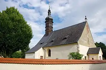 Devant l'église se trouve une statue de saint Jean Népomucène et trois croix de conciliation, dont l'une, une croix monolithique en pierre avec une tête cunéiforme et une gravure de croix, est également protégée en tant que monument culturel.