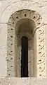 L'abside n'a ni pilastres ni décorations spéciales: seulement la série habituelle d'arcs suspendus; sur celle-ci il y a trois fenêtres évasées (dont la fenêtre centrale semble tamponnée). Comme d'habitude, le mur nord est le plus pauvre de décorations: il n'y a pas d'arches suspendus, et la seule fenêtre de ce côté montre, sur l'arc, des décorations avec des motifs en damier.