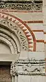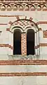 L'effet chromatique des bandes alternées de brique et de grès subsiste également dans les flancs et dans l'abside. Sur le mur sud, on peut voir un couronnement de simples arches reposant sur des frontons sculptés, sur ce côté, il y a trois grandes fenêtres décorées avec des motifs sculptés.