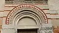 Le portail, légèrement en saillie, est surmonté d'un arc en plein cintre avec un double anneau: l'intérieur décoré par une ornementation en corne d'abondance, l’extérieur avec un motif à deux tons à « dents de loup », obtenu par l'alternance de dalles triangulaires en pierre et en briques. A droite on remarque une sculpture très endommagée d’un animale, tangentielle au cadre extérieur, il y a une frise sculptée et deux courtes demi colonnes