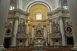 Le maître-autel, encadré par deux fortes colonnes corinthiennes, est en marbre polychrome. Au centre du retable, flanquée de deux sculptures d'anges porteurs de candélabres, se trouve l'icône miraculeuse de la Madonna dell'Aiuto. A l'entrée se trouvent trois tableaux de Gaspare Traversi, datés de 1749 et représentant la Nativité de Marie, l'Annonciation et l'Assomption de la Vierge. Sur la droite se trouve le tombeau de Gennaro Acampora, de Francesco Pagano (1738). Les anges qui soutiennent les candélabres de l'autel sont aussi de lui. La peinture représentant la Madonna dell'Aiuto est de Giuseppe Farina, tandis que la Fuite de saint Joseph est de Nicola Malinconico. Les ovales latéraux représentant l'archange saint Michel sont de Giacinto Diano.