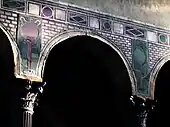 À l'intérieur, le dessus de la porte est orné d'une mosaïque présentant la dédicace originale de l'église, en hexamètres latins. La frise de la nef centrale est également un vestige du Ve siècle. La phrase est encadrée par deux figures féminines, qui correspondent à des personnification des figures allégoriques de l'Ecclesia Ex Circoncisione et l'Ecclesia Ex Gentibus.