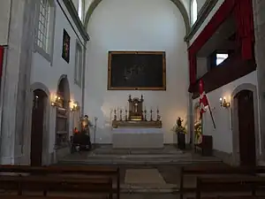 Sur les côtés, il y a deux panneaux d'azulejos représentant des scènes de la prise de Lisbonne aux Maures et de la Praça do Comércio. Le plan de l'église est en croix latine.