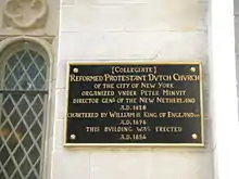 Lorsque les Britanniques acquièrent en 1664 la capitale administrative de la colonie de la Nouvelle-Néerlande et la rebaptisent New York, ils autorisent l'Église réformée néerlandaise à poursuivre son ministère. Le roi Guillaume III d'Angleterre accorde une charte royale à la paroisse en 1696, fondant du même coup la plus ancienne corporation des États-Unis[2].