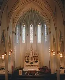 La paroisse de l'église Saint-Pierre est une augmentation constante, si bien qu'il est décidé en 1872 de faire construire une église plus grande au coin de la Bank Street et de la Ninth Street. Les paroissiens font appel à un architecte allemand de Chicago, Johann Dillinger, qui avait travaillé comme assistant-architecte à la cathédrale de Cologne et qui termine les plans de l'église en 1878. La première pierre est posée en 1879 et l'église consacrée le .