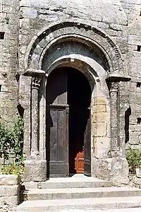 La façade méridionale est ornée d'un portail faisant saillie. Ce portail est encadré d'une paire de colonnes surmontées de chapiteaux sculptés de motifs végétaux. Il est surmonté d'une double archivolte. L'archivolte interne est biseautée et ornée de pointes de diamant : elle repose directement sur les piédroits, biseautés comme elle. L'archivolte externe repose sur les chapiteaux et est ornée d'une frise ornée de motifs décoratifs variés : damier, palmette, boules, pointes de diamant...