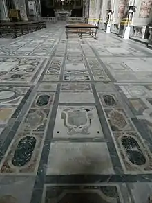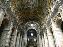 La Cène à la maison du Pharisien avec les saints Severino et Sossio sur les côtés placés dans la contre-façade, ainsi que les fresques de la voûte de la nef qui reflètent des scènes de saint Benoît, sont l'œuvre de Francesco De Mura datant environ de la première moitié du XVIIIe siècle[14], qui remplacent les travaux antérieurs de Corenzio commandés en 1609 qui concernaient la nef, le transept et le chœur, effondrés à la suite du tremblement de terre dévastateur de 1731. Les fresques du transept restent des œuvres originales de Corenzio, ainsi que celles de la plupart des chapelles latérales ; le dôme voit à la place des cycles du flamand Paul Schepers exécutés en 1566 tandis que les stucs de la nef sont de Giuseppe Scarola[15]. Le sol de la nef remonte au XVIe siècle[15] et se caractérise par la présence de nombreuses dalles sépulcrales qui se succèdent, dont celle du peintre d'origine grecque Belisario Corenzio, mort en tombant de l'échafaudage de l'église alors qu'il fresque la voûte, à l'âge de 80 ans.