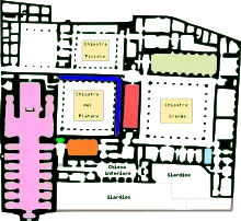 Le monastère, l'un des plus grands de la ville, se développe sur le côté est de l'église, à proximité des remparts de l'ancien centre-ville, donc sous le decumanus inférieur.