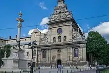 Sur la place, devant l’église, se trouve une colonne décorative, sur laquelle, dans le passé, se trouvait une statue de Jean de Dukla, patron de Lviv, au sud de l’église. Sur le côté est une rotonde, au-dessus d’un puits. Le monument fut restauré maintes fois et les derniers travaux datent de 1960-1970. C’est un des plus beaux ensembles de Lviv de la période des XVIIe et XVIIIe siècles, qui mélange les styles de l’architecture Renaissance, tout en portant déjà en lui des changements apportés par le maniérisme, si présent dans la ville durant les siècles qui suivent.
