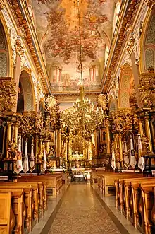 L'intérieur, réalisé au XVIIIe siècle, se distingue par une décoration baroque et même rococo, comme en témoignent les ornementations en stuc doré qui chargent les dessus des piliers et le fond de l'abside remarquable. Les murs ont été décorés par des peintures de B. Mazourkevitch, aidé de V. Bortnitsk, P. Voliansky et N. Sorotchinsky, entre 1738 et 1740. Le plafond est rehaussé de peintures en trompe-l'œil, caractéristiques du baroque tardif. Les sculptures en bois (1640-1641), du ciseau de Paul de Bydgotch, n'ont pas été conservées mais, au début du XXe siècle, des reproductions très fidèles ont été réalisées. Le bâtiment a été restauré dans les années 1970.