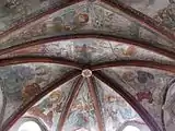 Dans le chœur de l'église simultanée, dédiée à Notre-Dame, on peut admirer des fresques peintes au XVe siècle, illustrant les mystères du christianisme, tel que le couronnement de la Vierge, le Jugement dernier. D'autre part, des dalles funéraires sont apposées contre les murs du sanctuaire.
