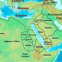 Le long conflit qui avait opposé les Empires byzantin et sassanide se termine en 591 lorsque l’empereur Maurice (r. 582 – 602) aide le roi Khosro II (r. 590-628) à regagner son trône. En 602, Maurice est assassiné par son rival, Phocas. Prétendant venger Maurice, Khosro déclare la guerre à l’Empire byzantin, guerre qui enflamme l’Égypte, le Levant et la Mésopotamie, culminant avec la conquête de Jérusalem en 614 et d’Alexandrie en 619. Ces succès initiaux sont de courte durée et l’arrivée au pouvoir de l’empereur Héraclius (r. 610 – 641) renverse la situation, Khosro lui-même est renversé en 628[59]. Son fils, Kavadh II, qui ne régna que quelques mois en 628, a tout de même le temps de conclure un accord avec l’Empire byzantin qui retournait à celui-ci les territoires conquis par son père.