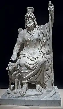 Au début de la période ptolémaïque, Ptolémée Soter avait introduit le culte de Sérapis, dieu syncrétique aux caractéristiques helléniques et égyptiennes, possiblement relié au culte d’Osiris-Apis. Sérapis reprend dans le panthéon égyptien le rôle d’Osiris, dieu de la vie future et de la régénération, époux d’Isis, déesse de la fertilité, et père d’Horus connu dans le monde hellénique comme Harpocrate. Les empereurs sont quelquefois représentés sous les traits de Sérapis avec ses attributs caractéristiques, celui-ci comme Osiris, et contrairement aux autres dieux égyptiens n’étant jamais représenté avec des parties animales. Ses traits caractéristiques sont ses vêtements à la mode grecque, ses longs cheveux et sa barbe de même que sa couronne à dessus plat appelée calathus[93].