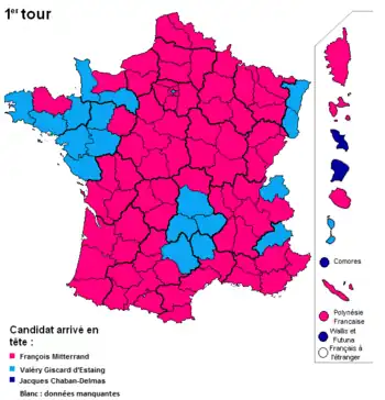 Le premier tour est marqué par l'opposition entre l'ancien Premier ministre gaulliste Jacques Chaban-Delmas, le ministre des Finances, Valéry Giscard d'Estaing, et le premier secrétaire du Parti socialiste et candidat de l'union de la gauche, François Mitterrand.