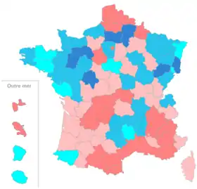 Pour être élu au premier tour, un binôme doit obtenir la majorité absolue des suffrages exprimés et un nombre de suffrages au moins égal à 25 % des électeurs inscrits[16]. Si aucun binôme n'est élu au premier tour, seuls peuvent se présenter au second tour les binômes qui ont obtenu un nombre de suffrages au moins égal à 12,5 % des électeurs inscrits, sans possibilité pour les binômes de fusionner. Si un seul binôme a obtenu 12,5 % des inscrits, ou si aucun binôme n'a obtenu au moins 12,5 %, les deux binômes ayant obtenu le plus de voix au premier tour peuvent se présenter[17],[18]. Est élu au second tour le binôme qui obtient le plus grand nombre de voix[16],[19],[20].