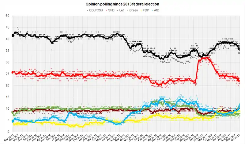 La CDU/CSU ainsi que le Parti social-démocrate (SPD) enregistrent leurs pires résultats depuis les élections d'après guerre, tandis que l'Alternative pour l'Allemagne entre pour la première fois au Bundestag et que le Parti libéral-démocrate (FDP) y fait son retour après son élimination au scrutin précédent. Les Verts et Die Linke progressent quant à eux de quelques sièges. À la suite de l'annonce de la décision du SPD de se positionner dans l'opposition, rendant impossible le renouvellement du gouvernement sortant, une coalition entre la CDU/CSU, le FDP et les Verts, dite « coalition Jamaïque », est considérée comme hautement probable. Le FDP se retire néanmoins des négociations le soir du , constatant l'échec de la mise en place d'un projet commun aux trois partis. De nouvelles élections en 2018 sont jugées probables par l'opinion allemande[1]. Cependant, le , le SPD se dit prêt à entamer des discussions sur une coalition avec la CDU/CSU, les discussions devraient commencer le et se terminer le , mais avec un résultat incertain.