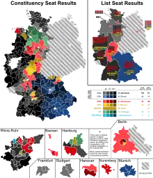 Lors des élections fédérales du , la nouvelle alliance chrétienne-démocrate CDU/CSU, emmenée par le président du Conseil parlementaire Konrad Adenauer, devient la première force politique de la nouvelle République fédérale. Avec 31 % des voix et 139 parlementaires sur 402, elle devance le Parti social-démocrate d'Allemagne (SPD), vieux de 74 ans, pilier de la république de Weimar et qui réunit 29,2 % des suffrages exprimés et 131 députés.