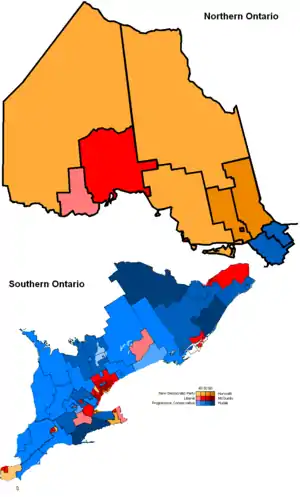 Le Parti libéral de l'Ontario formera un gouvernement minoritaire. le Parti progressiste-conservateur de l'Ontario (PC) représentera l'Opposition officielle et le Nouveau Parti démocratique de l'Ontario (NPD) agira comme tiers parti[2].